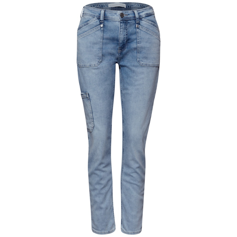 Deze cargo jeans van Street One in de Charlie stijl heeft een trendy gebleekte look met praktische zakken en een stretch tailleband aan de achterkant. Deze jeans met slanke broekspijpen bieden je een moderne casual look met een comfortabele losse pasvorm.