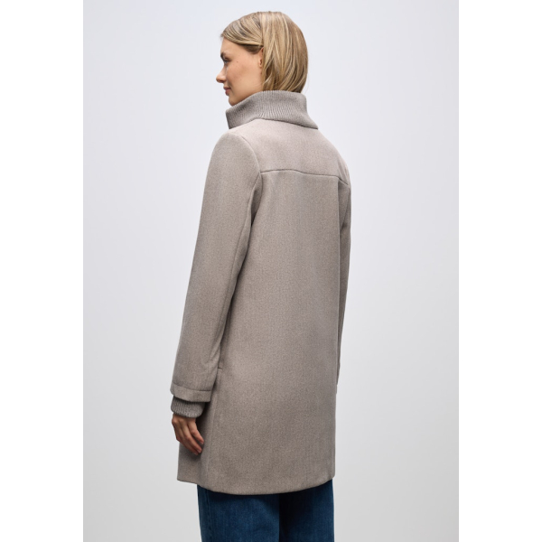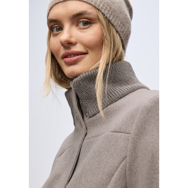 Gebreide elementen op de opstaande kraag zorgen voor een stijlvol accent, terwijl de wollen look voor een hoogwaardige uitstraling zorgt.