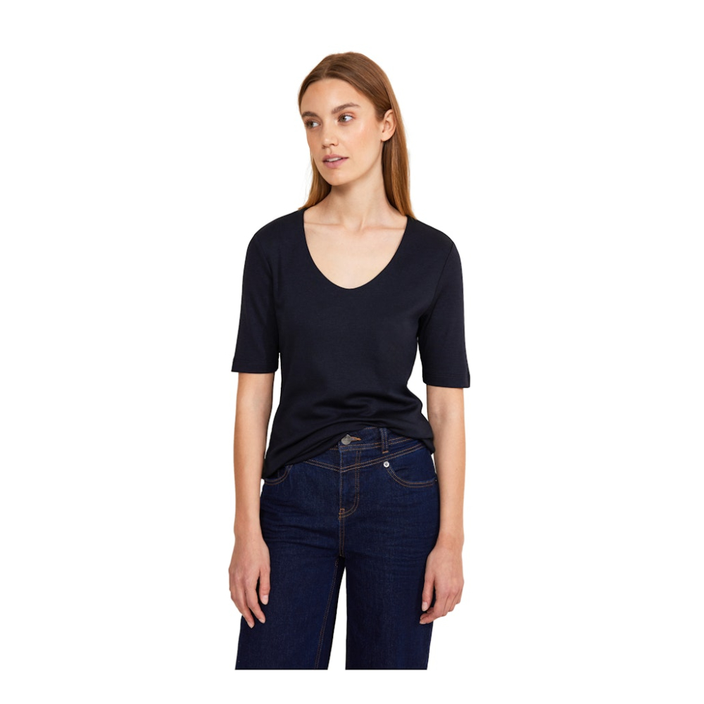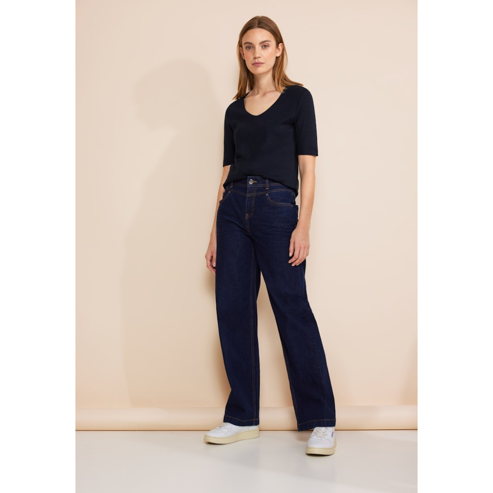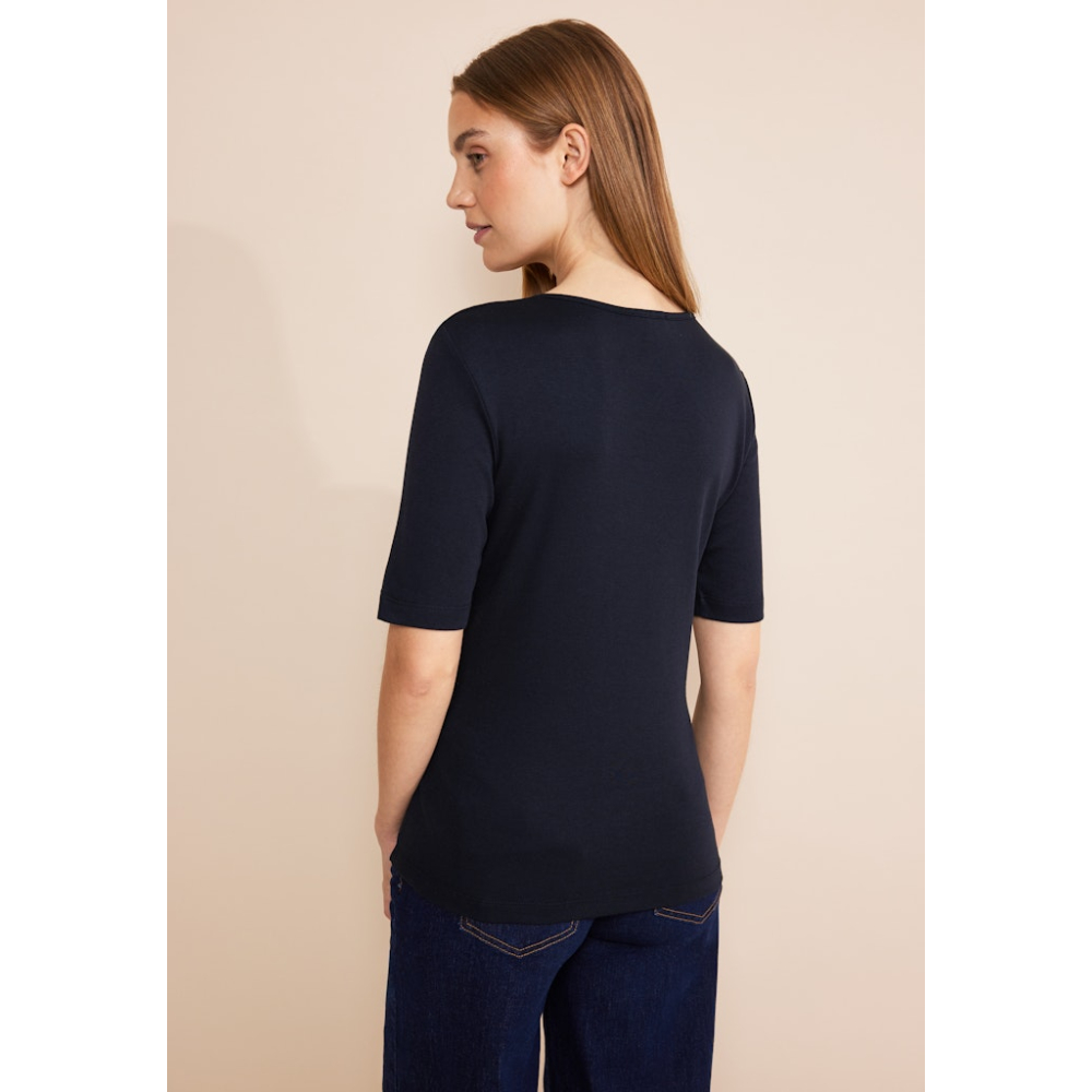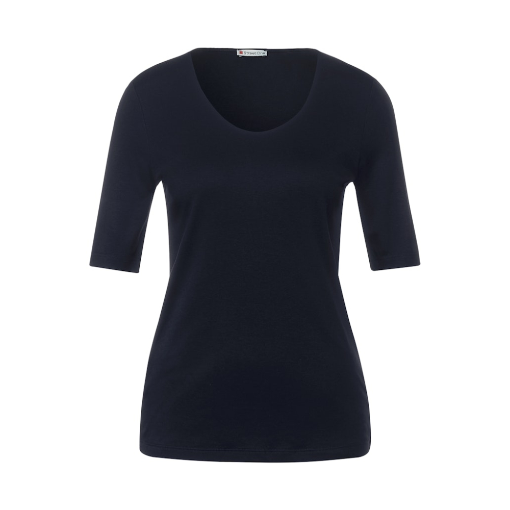 Het Palmira shirt van Street One met verlengde T-shirt mouwen, een afgeronde V-hals en een losse pasvorm is een absolute must-have in je garderobe! Gemaakt van 50% katoen en 50% modaal Kleur : Deep Blue
