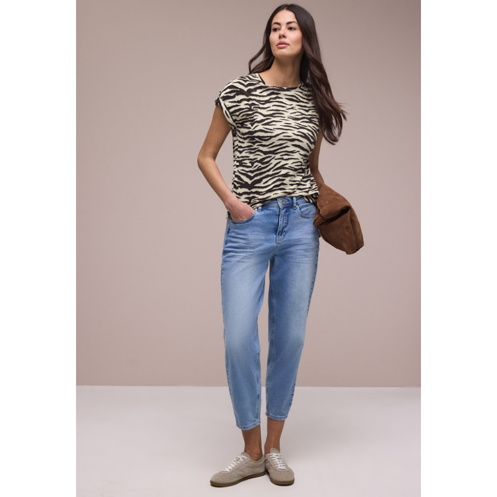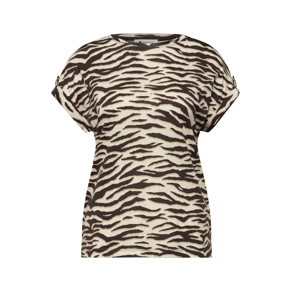 Comfortabel jersey shirt van Street One met een ronde hals en leopard print. Het shirt heeft een knoopdetail op de mouwen. Gemaakt van 50% katoen en 50% modal Kleur : Espresso Brown