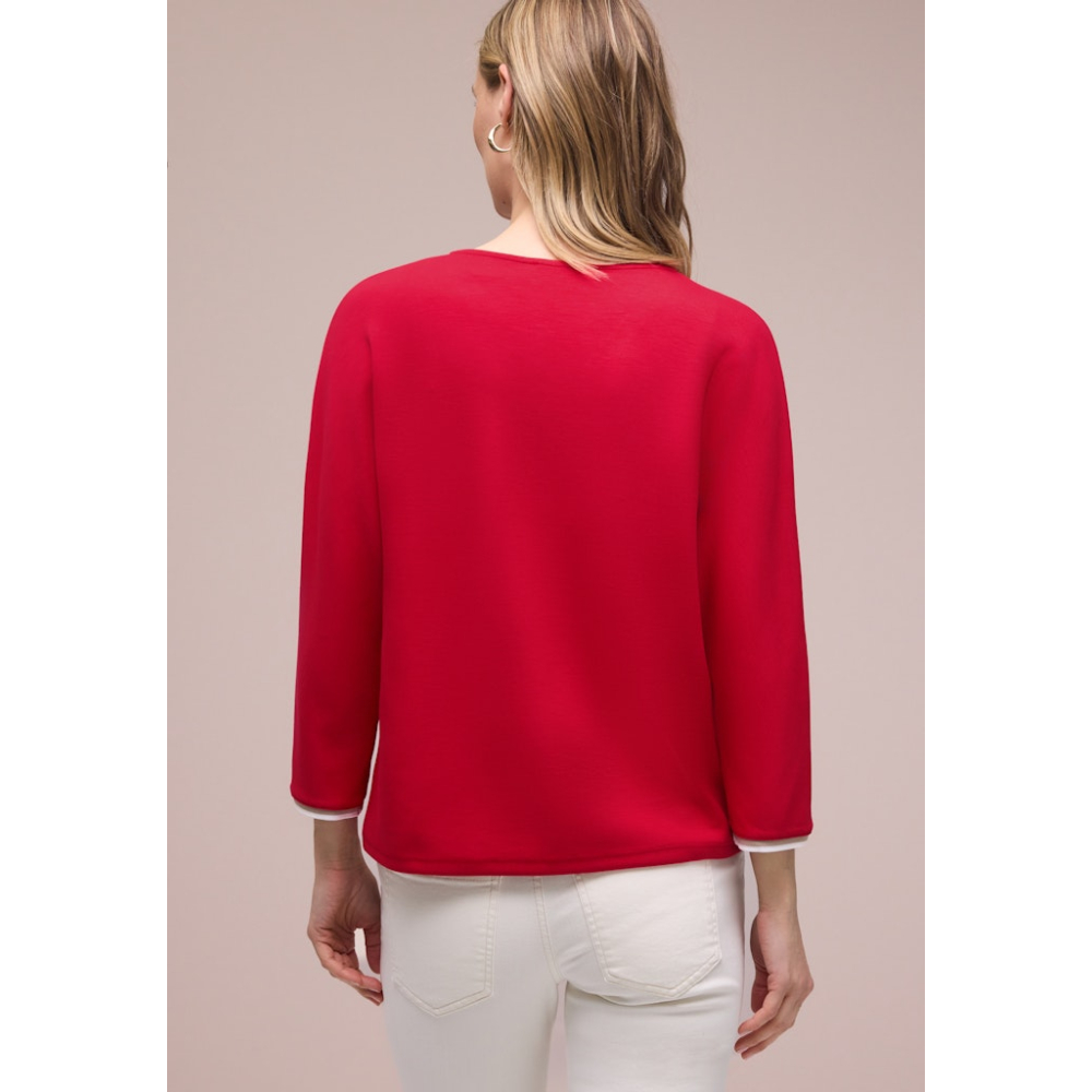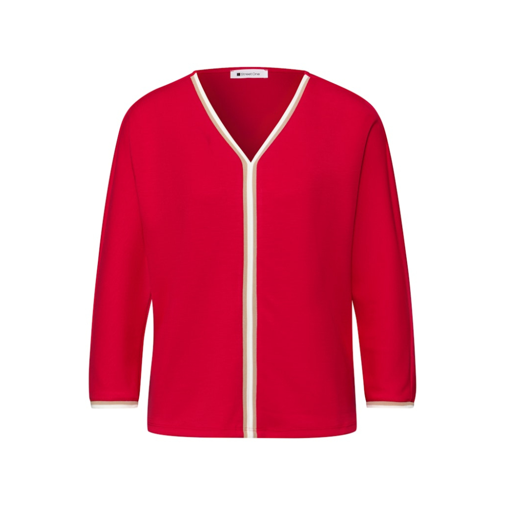 Dit comfortabele jersey shirt van Street One met een V-hals heeft driekwart mouwen en contrasterende streepdetails. Gemaakt van 48% polyester, 48% viscose en 4% elastaan Kleur : Salsa Red