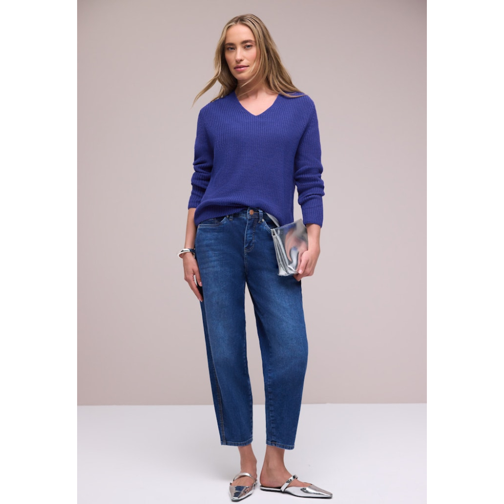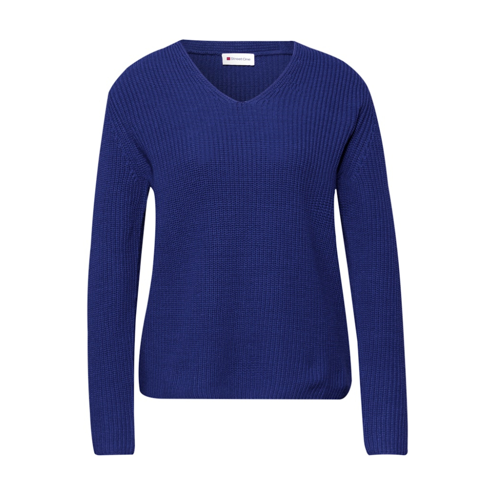Deze effen gebreide trui van Street One heeft een V-hals en geribde textuur. De comfortabele pasvorm past perfect bij relaxte alledaagse looks en kan op verschillende manieren worden gecombineerd.