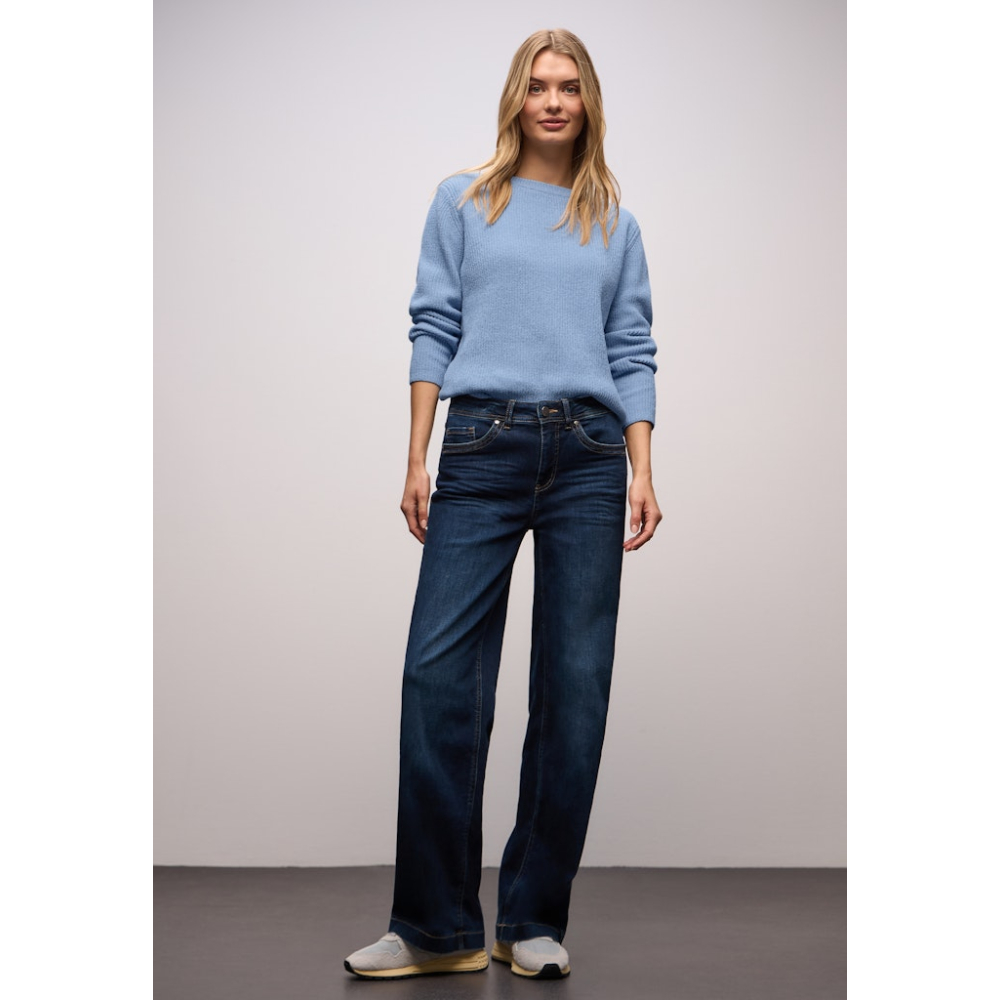 Deze Street One trui in een zachte chenille kwaliteit heeft een vrouwelijke boothals. Een gebreide trui om je goed in te voelen en makkelijk is om mee te stylen. Gemaakt van 72% polyester en 28% katoen Kleur : Frosted Blue