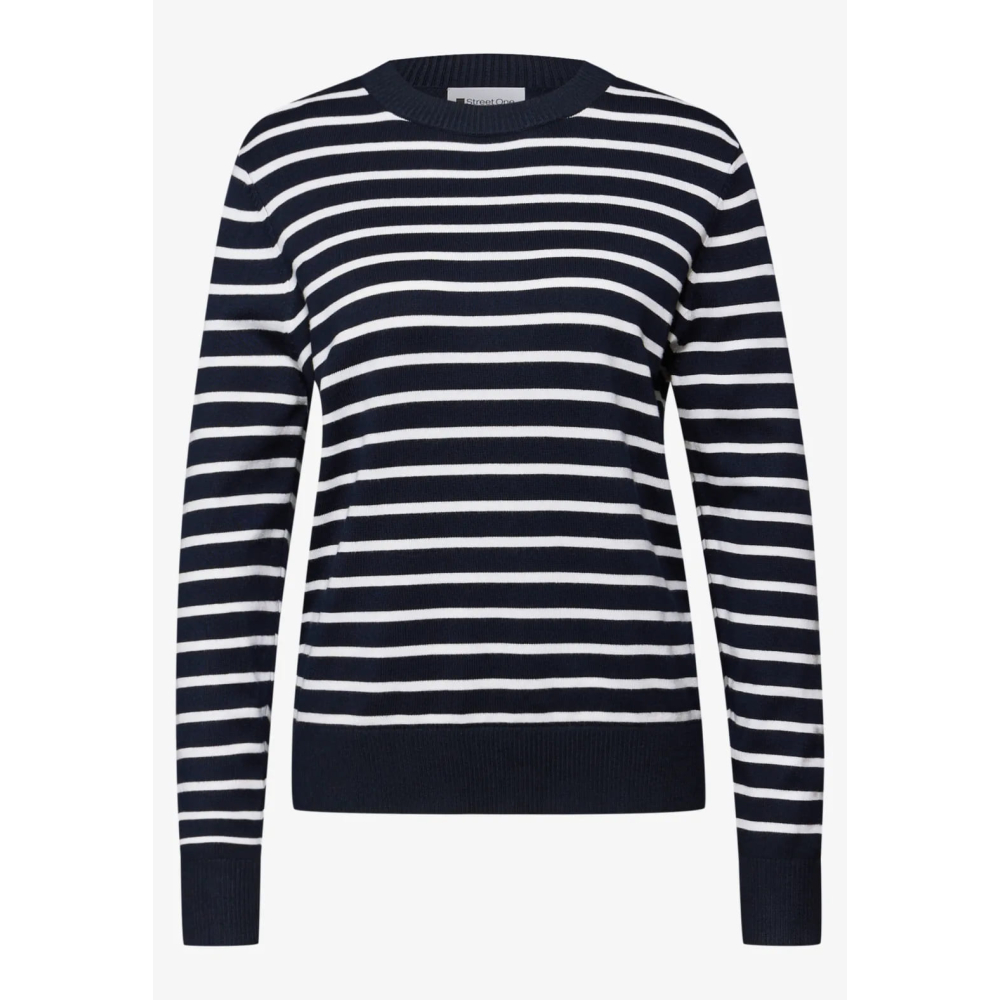 Deze gestreepte trui van Street One heeft een ronde hals, lange mouwen en een klassiek gestreept patroon. Een zachte trui met een geribde textuur op de tailleband en manchetten maakt het een comfortabele allrounder. Kies deze trui als je van knusse looks met een patroon houdt.