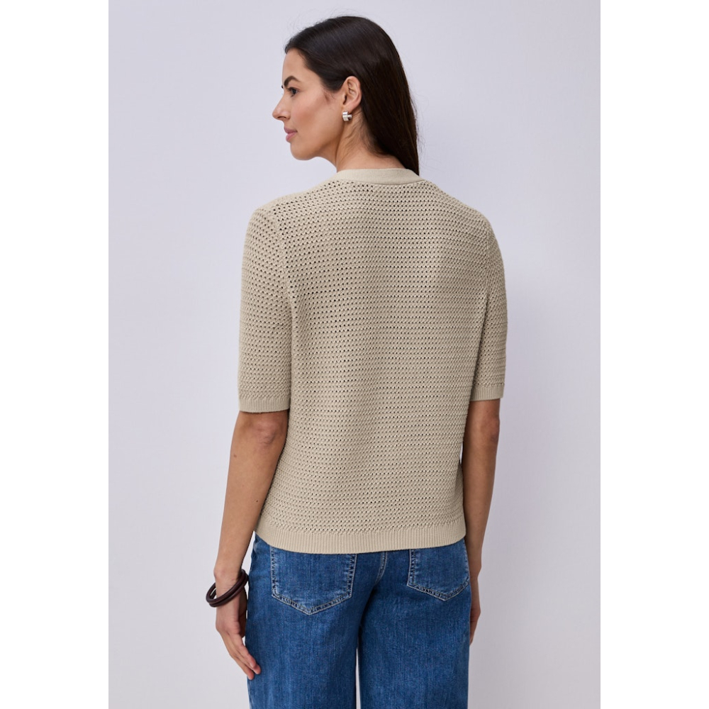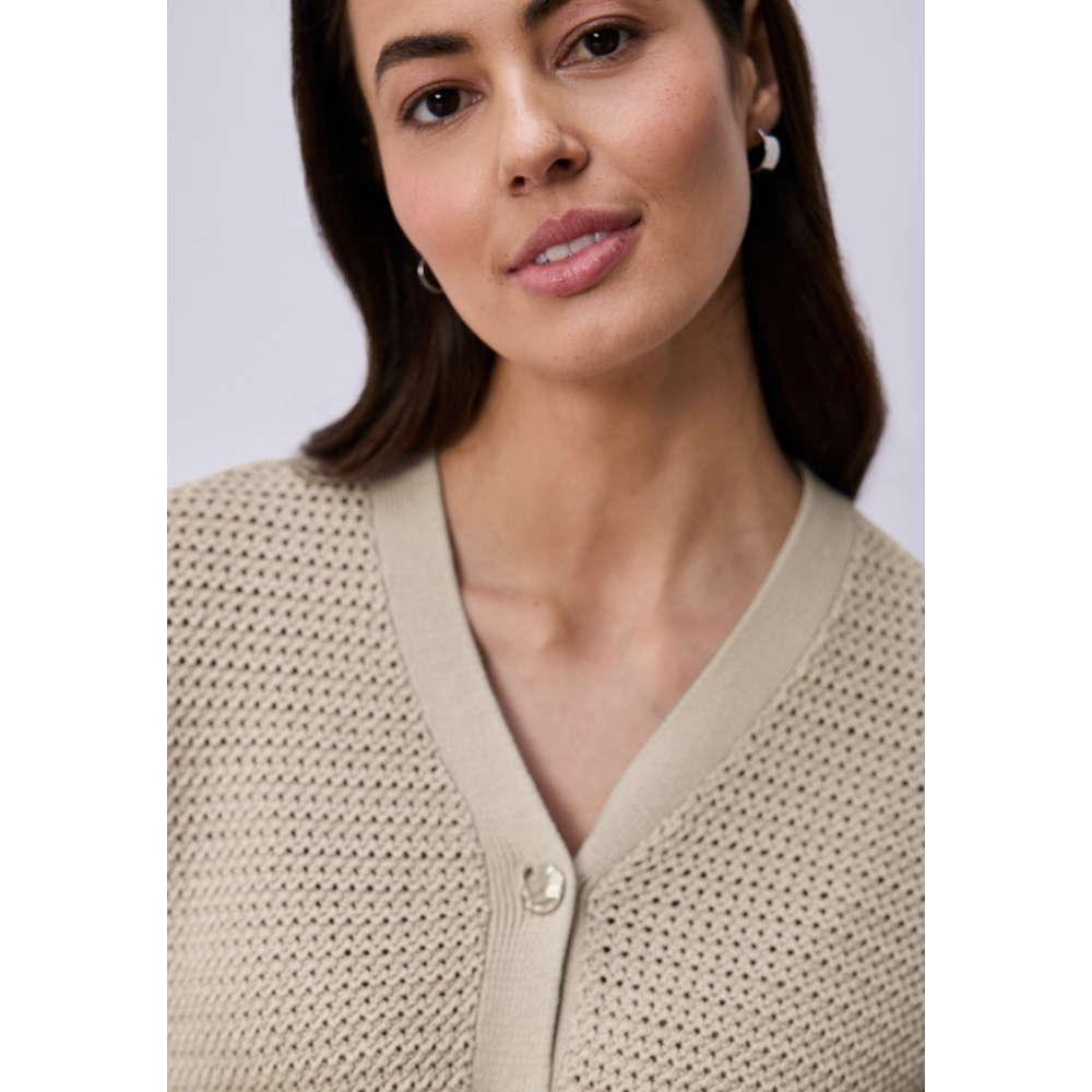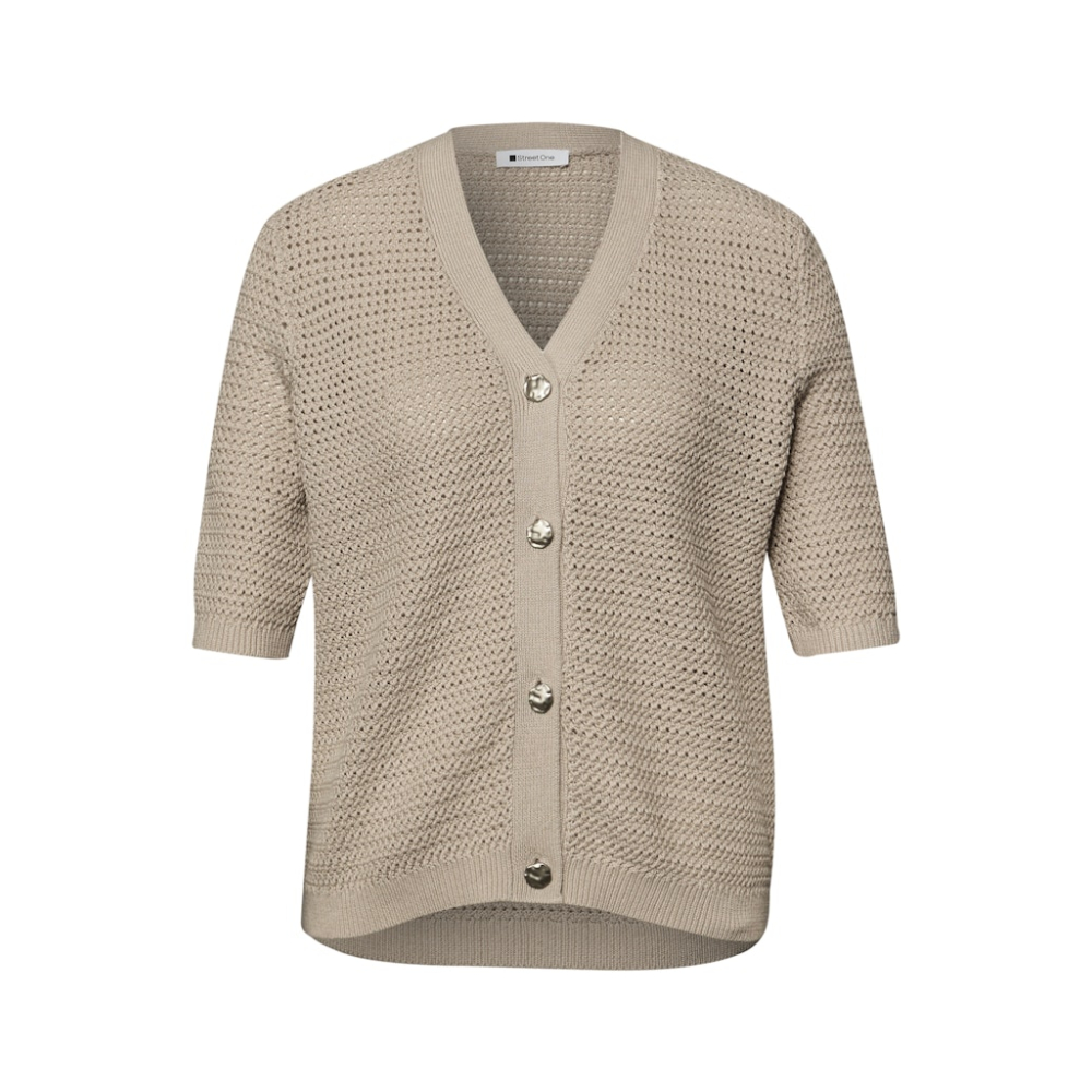 Dit opengewerkte vestje van Street One is de perfecte zomerse aanvulling op jouw casual garderobe. De V-hals hals en sierlijke knoopsluiting geven het ontwerp een eenvoudige, vrouwelijke touch. De korte mouwen zorgen voor een luchtig gevoel. Een veelzijdige basic die je gemakkelijk over tops of jurken kunt dragen.