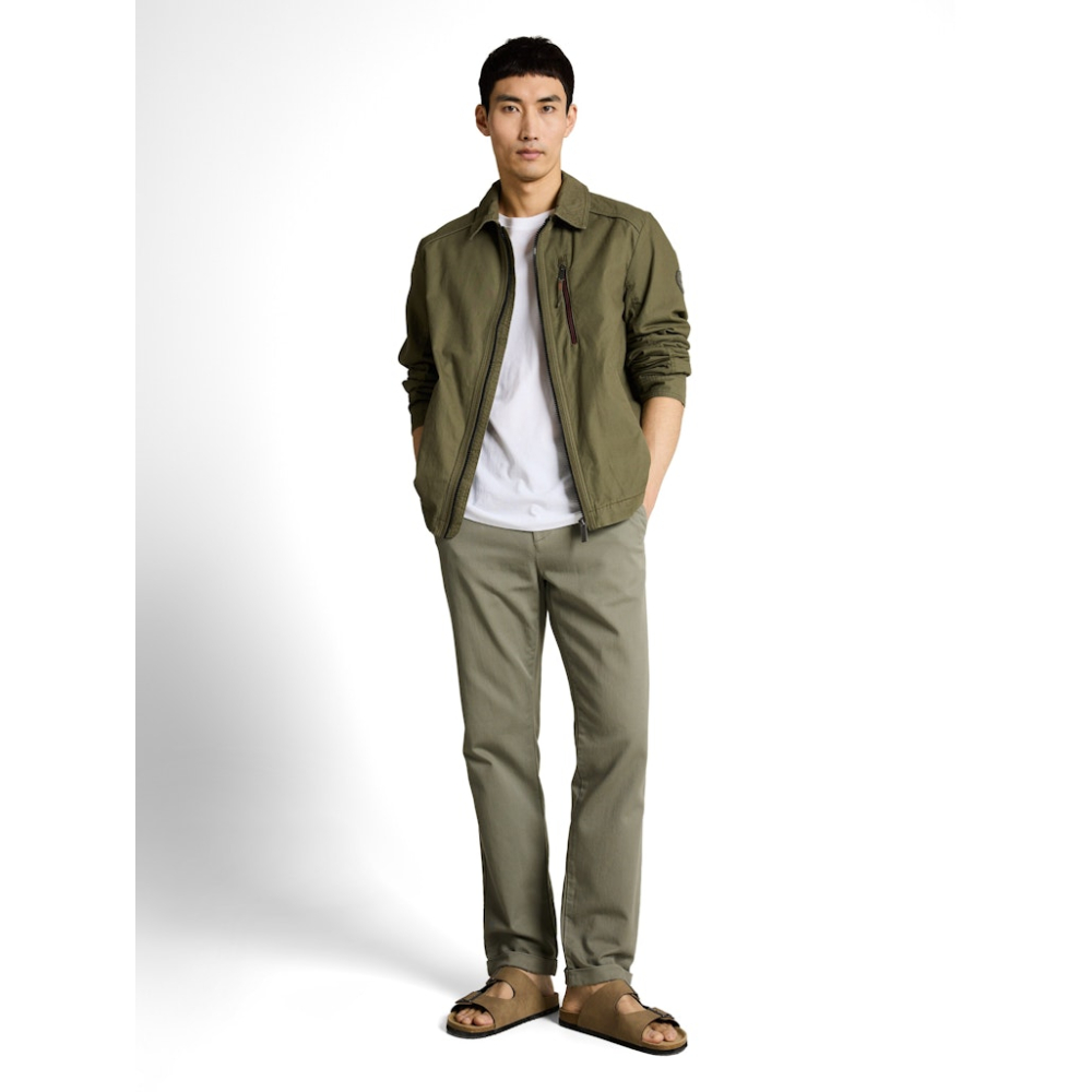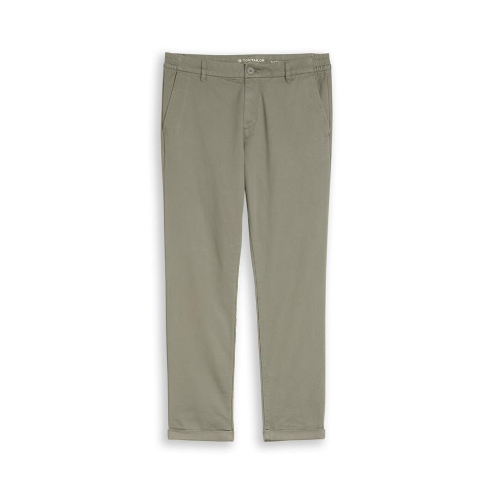 Comfortabele chino van Tom Tailor met een elastische inzet aan de tailleband. Deze chino heeft een normale taille, rechte broekspijp en fijne steekzakken. Regular Fit Gemaakt van 69% katoen en 31% modal Kleur : Greyish Shadow Olive