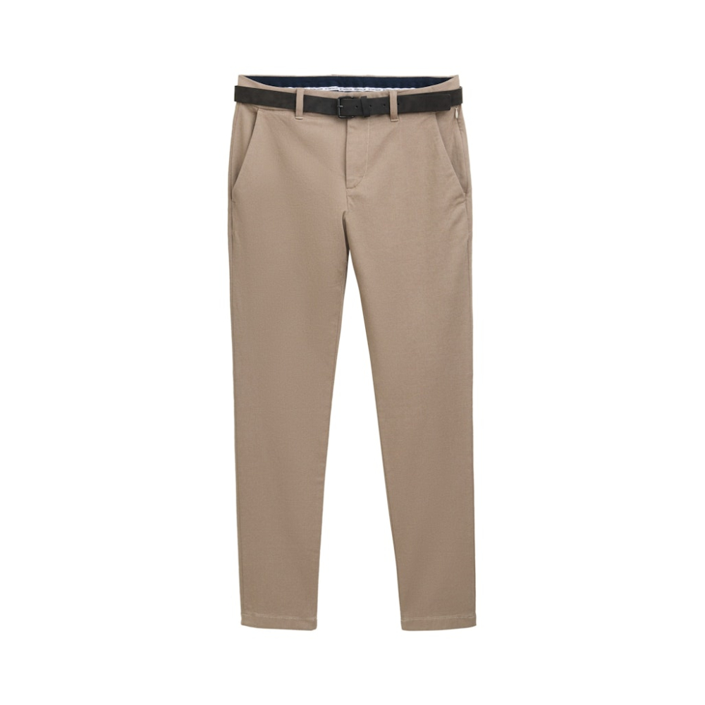 De comfortabele Travis chino van Tom Tailor met zigzag structuur heeft een normale taille en smalle pijpen. De broek heeft naast de steek- en paspelzakken ook een riem van PU-leer.