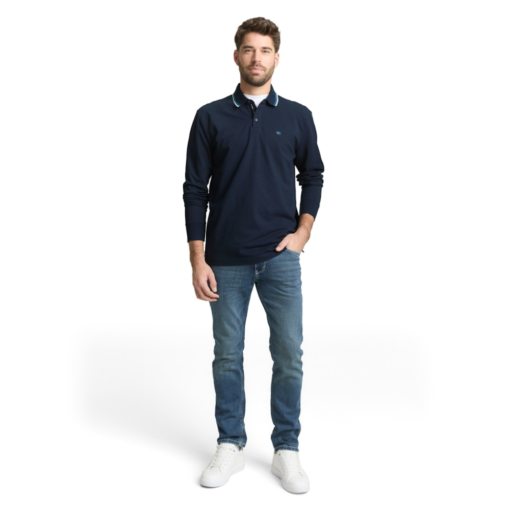 Comfortabel pique polo shirt van Tom Tailor met contrasterende strepen op de kraag. Deze longsleeve polo is afgewerkt met een knoopsluiting. Regular Fit Gemaakt van 95% katoen en 5% elastaan Kleur : Sky Captain Blue