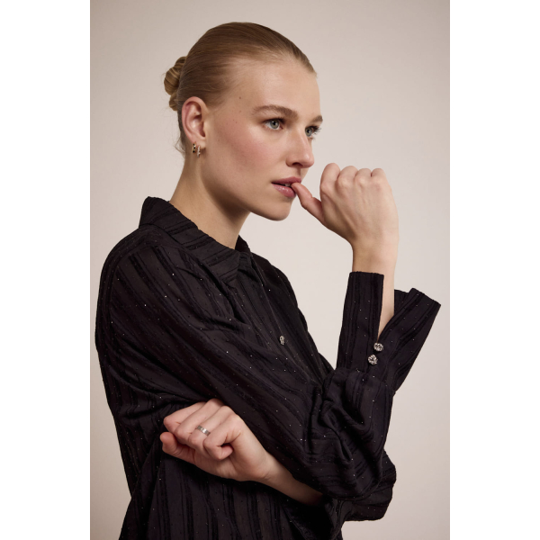 De subtiele rhinestone details aan de voorzijde voegen een vleugje luxe en glamour toe, waardoor deze blouse ideaal is voor zowel een zakelijke look als een chique avondje uit.