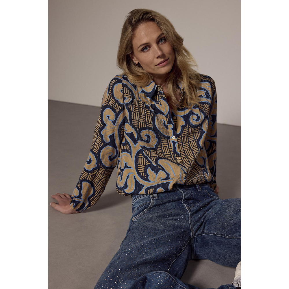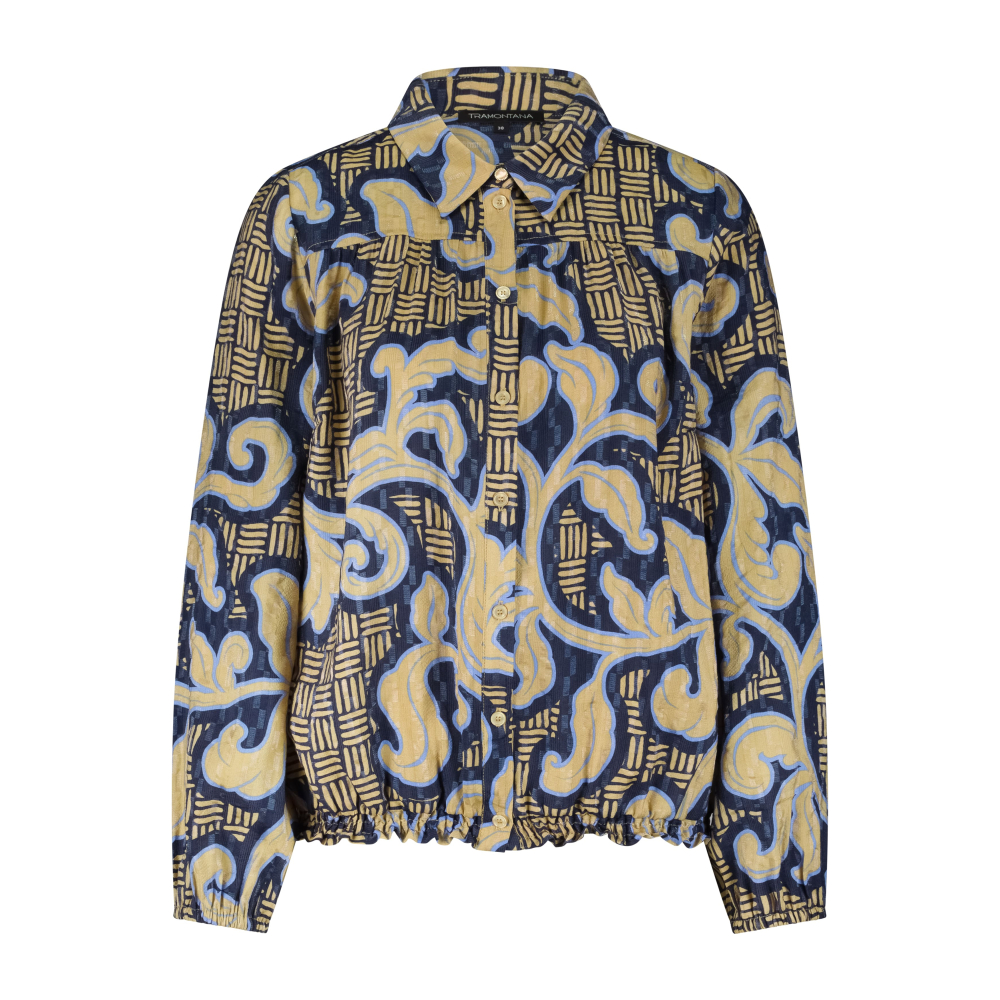 Een opvallende en stijlvolle Tramontana blouse met een rococo patroon wat een vleugje kunstzinnigheid toevoegt aan jouw look. Het bijzondere tie-detail aan de voorkant zorgt voor een vrouwelijke, flatterende uitstraling die je outfit net dat beetje extra flair geeft. Of je de blouse nu draagt met een nette broek voor een chique outfit of met een jeans voor een meer ontspannen look, deze blouse biedt eindeloze mogelijkheden.