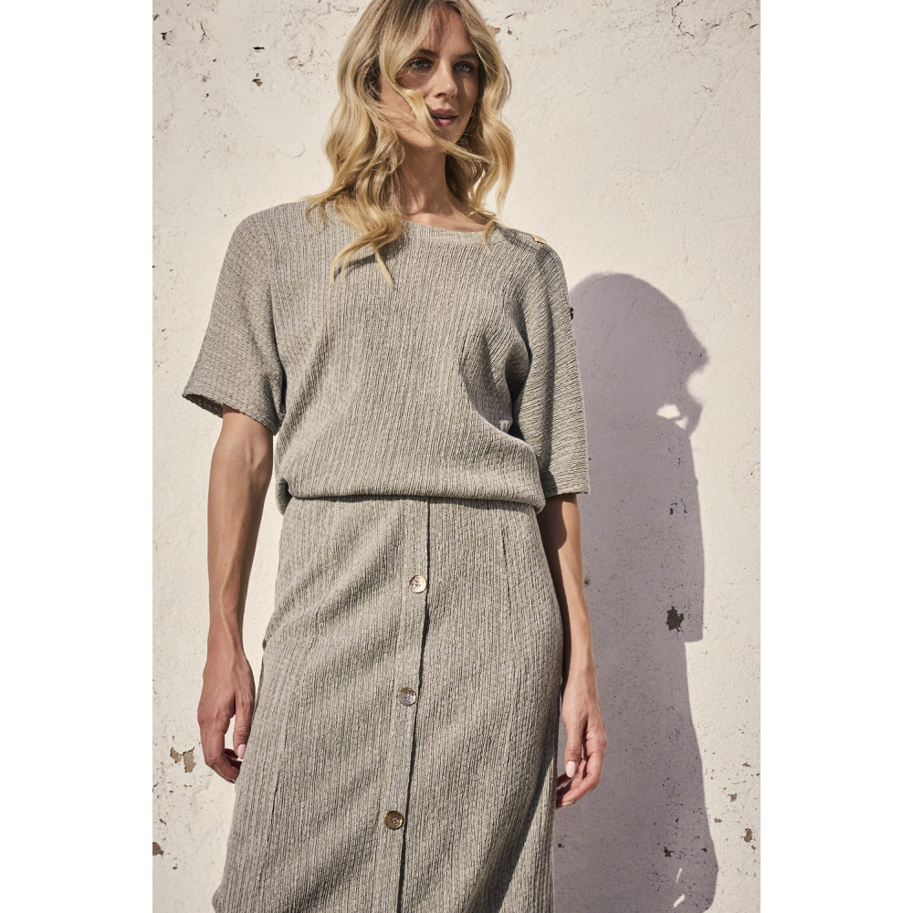Een luchtige en vrouwelijke top van Tramontana met een verfijnde, nonchalante uitstraling en subtiele details. De karakteristieke crinkle-structuur geeft het ontwerp een moderne, speelse look en zorgt voor een mooie, natuurlijke valling. Het button detail voegt een verfijnd accent toe en geeft de top een elegante, vrouwelijke touch. Draag de top met de bijpassende broek voor een stijlvolle co-ord look, of combineer met denim of een lichte pantalon voor een ontspannen, casual-chique outfit. Een veelzijdige top die comfort, textuur en moderne elegantie moeiteloos samenbrengt.