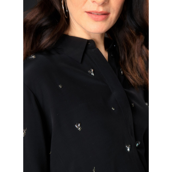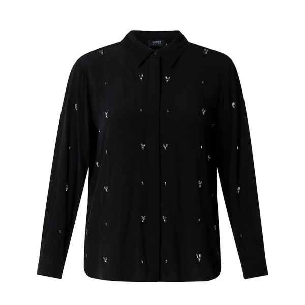 De Yest blouse valt soepel en voelt heerlijk zacht, die fonkelende strass steentjes maken hem helemaal bijzonder.