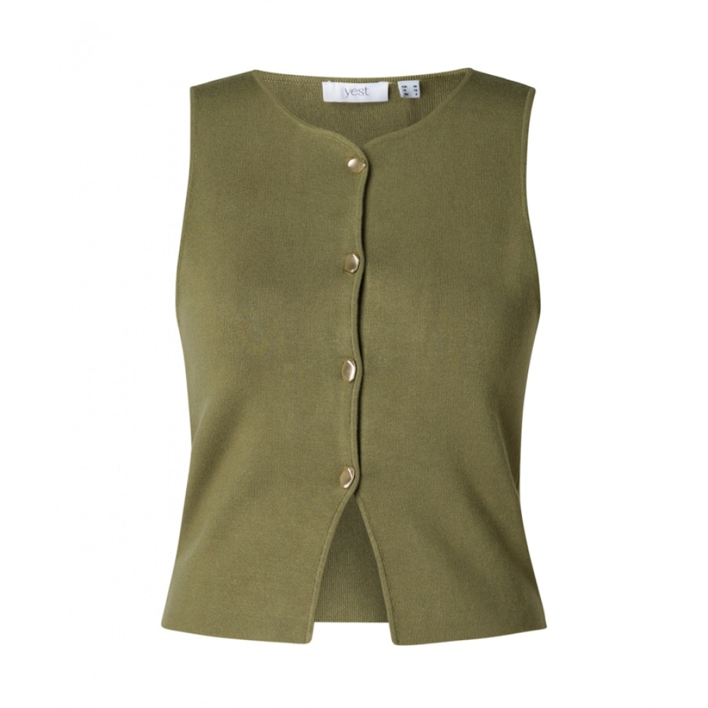 Dit gebreide gilet vestje van Yest heeft glanzende knopen als subtiel detail dat het ontwerp net iets chiquer maakt. Perfect om mee te layeren in het seizoen. Gemaakt van 81% viscose en 19% nylon Kleur : Olive