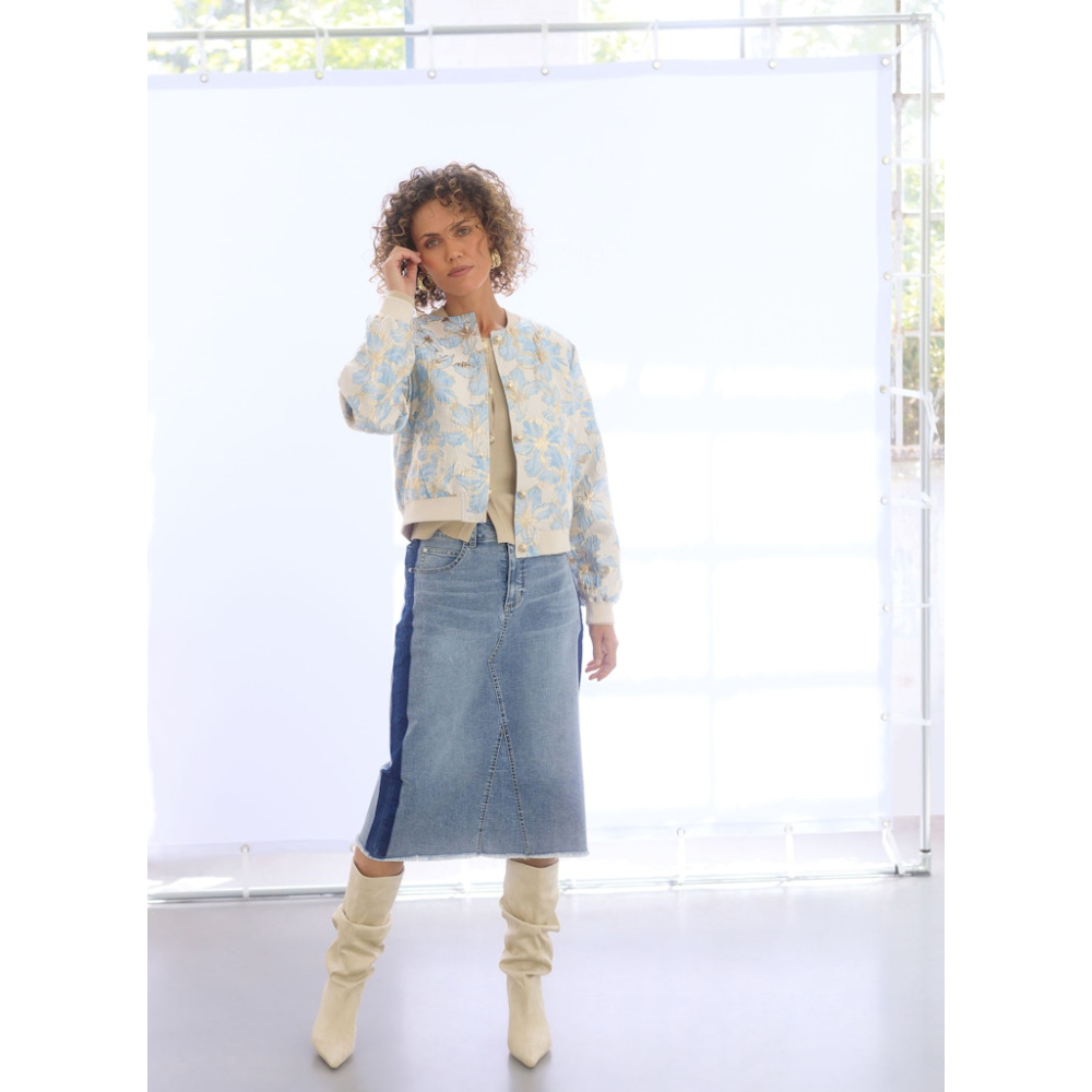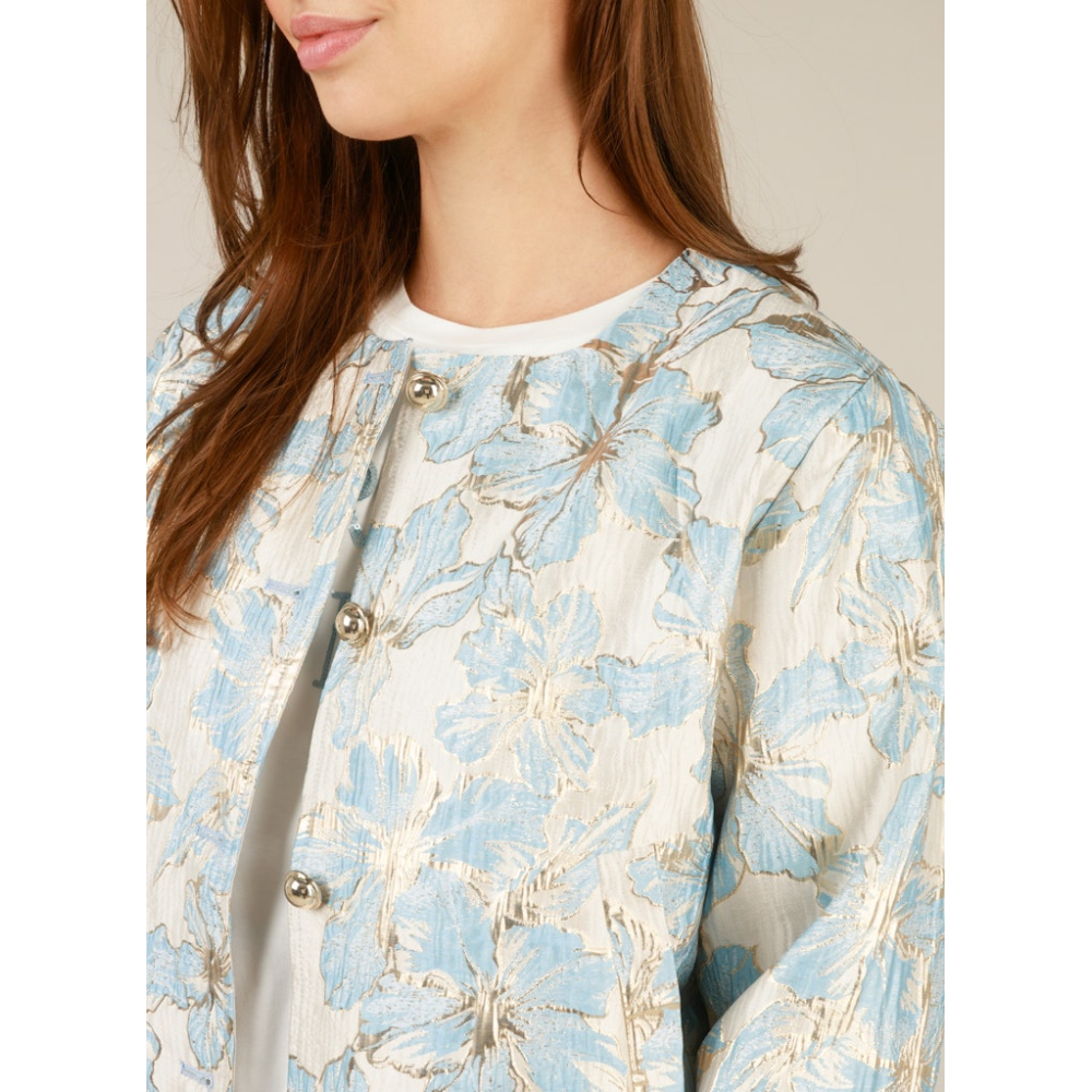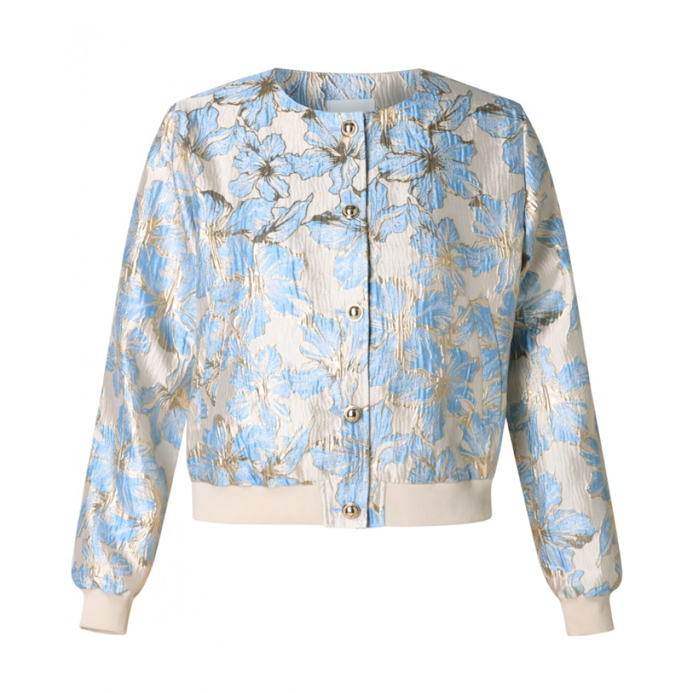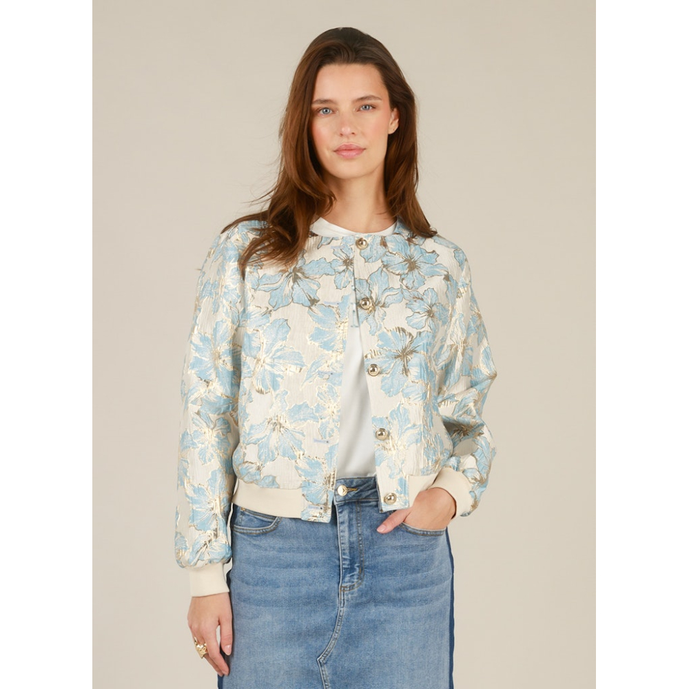 Dit Ivana jasje van Yest combineert een klassieke bombervorm met een brokaatstof vol structuur en licht glanseffect. De ronde hals en de goudkleurige knopen zorgen voor een verzorgde uitstraling.
