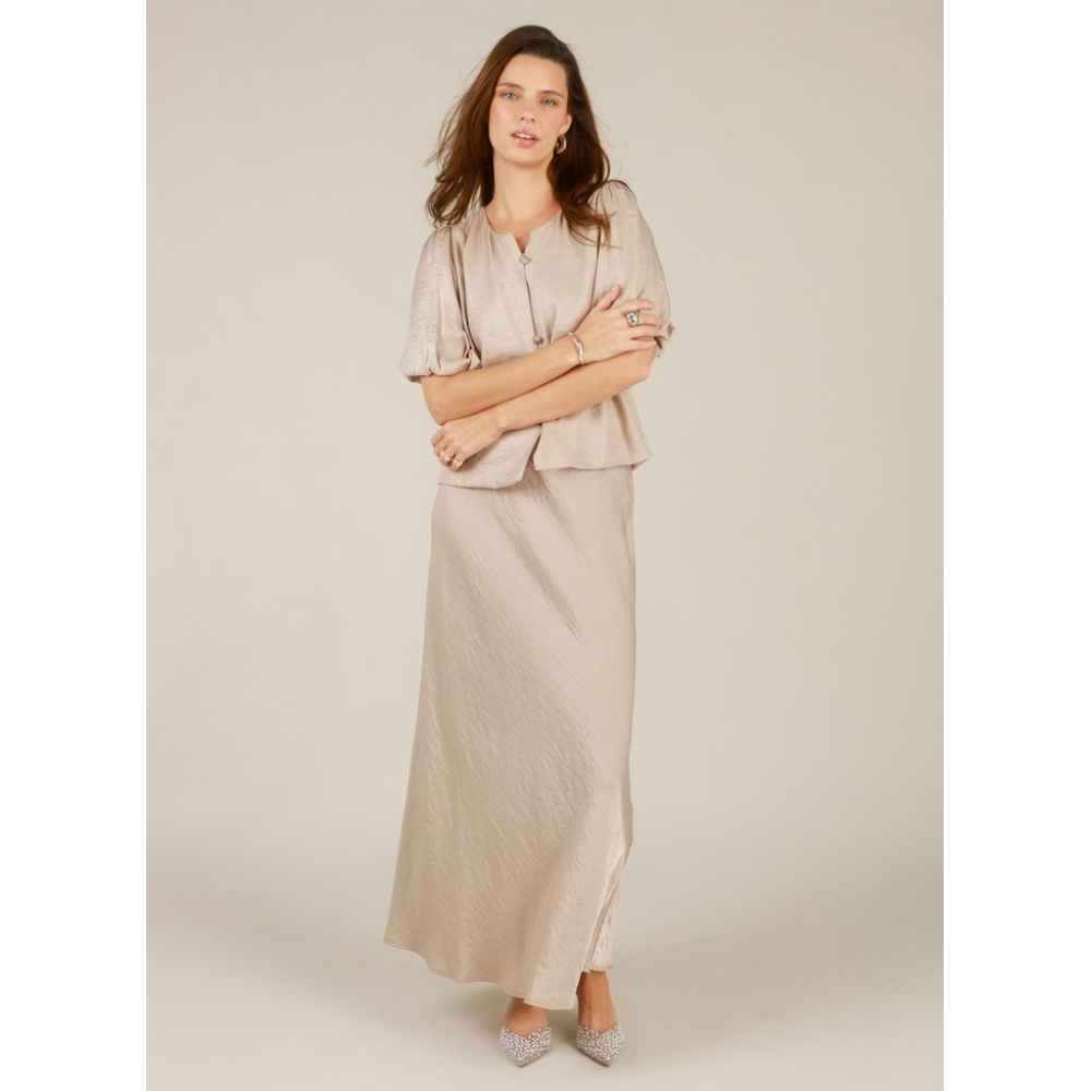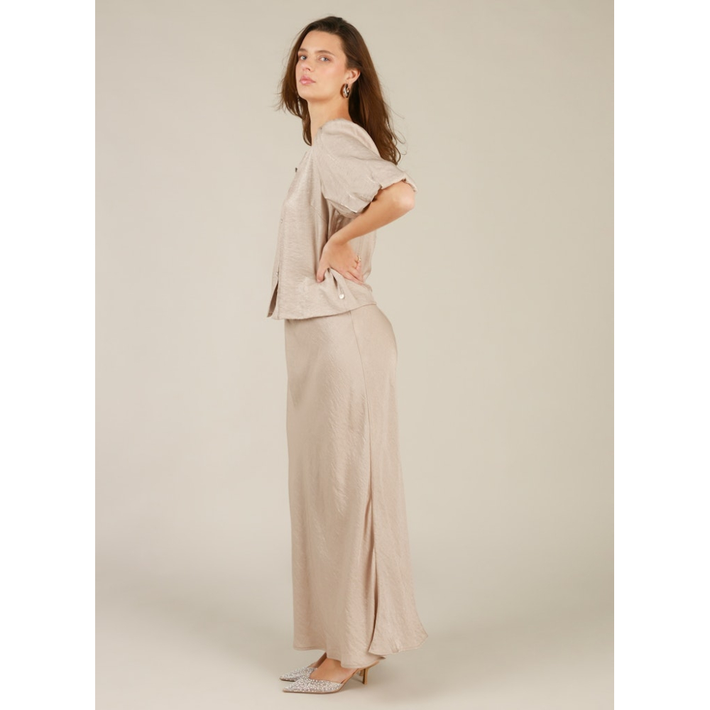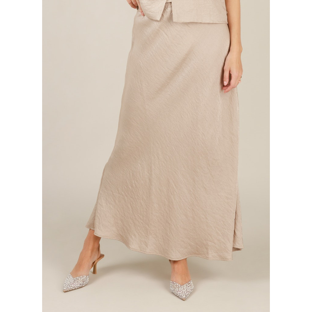 Deze enkellange Imani rok van Yest heeft een subtiele A-lijn en een elastische tailleband die mooi aansluit zonder te knellen. De soepele stof valt natuurlijk langs het lichaam. Met de zachte kleur biedt de rok veelzijdige opties voor rustige, tonale looks.