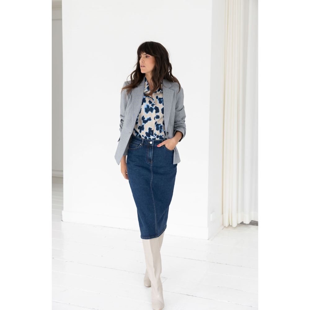 High waist denim rok van Yest met een donkere vintage wassing die valt tot net over de knie. De rok sluit met een rits en een knoop en heeft een split achter dat ervoor zorgt dat je ook nog lekker kunt blijven bewegen. Dankzij de tijdloze uitstraling kan deze rok eenvoudig worden gecombineerd met verschillende tops voor een chique maar ook casual look.