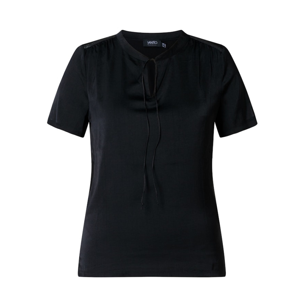 Een comfortabele top van Yest met een vleugje sparkle. De ronde hals met strikkoordje geeft een vrouwelijk detail, terwijl de glittertape en steentjes op de mouwen zorgen voor een feestelijk accent.