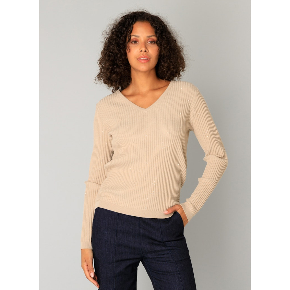 Dit truitje met een V-hals van Yest is ribgebreid in een dunne kwaliteit die soepel draagt en licht aanvoelt. De fijne pailletten zijn perfect om een basic outfit nét dat beetje sprankel te geven.