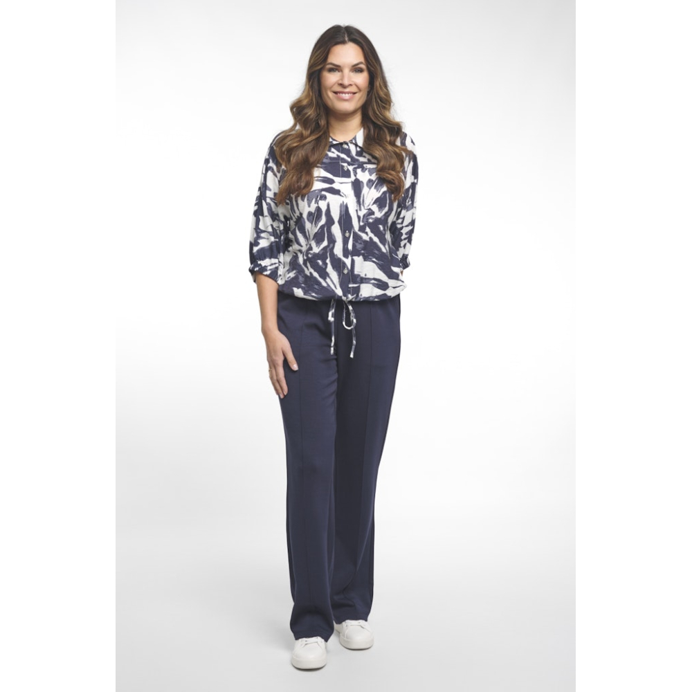 Luchtige blouse van Zoso met een klassieke blousekraag en prachtige print. Deze blouse heeft korte pofmouwtjes en een strikkoord in de taille. Gemaakt van 86% ecovero viscose en 14% polyamide Kleur : Navy